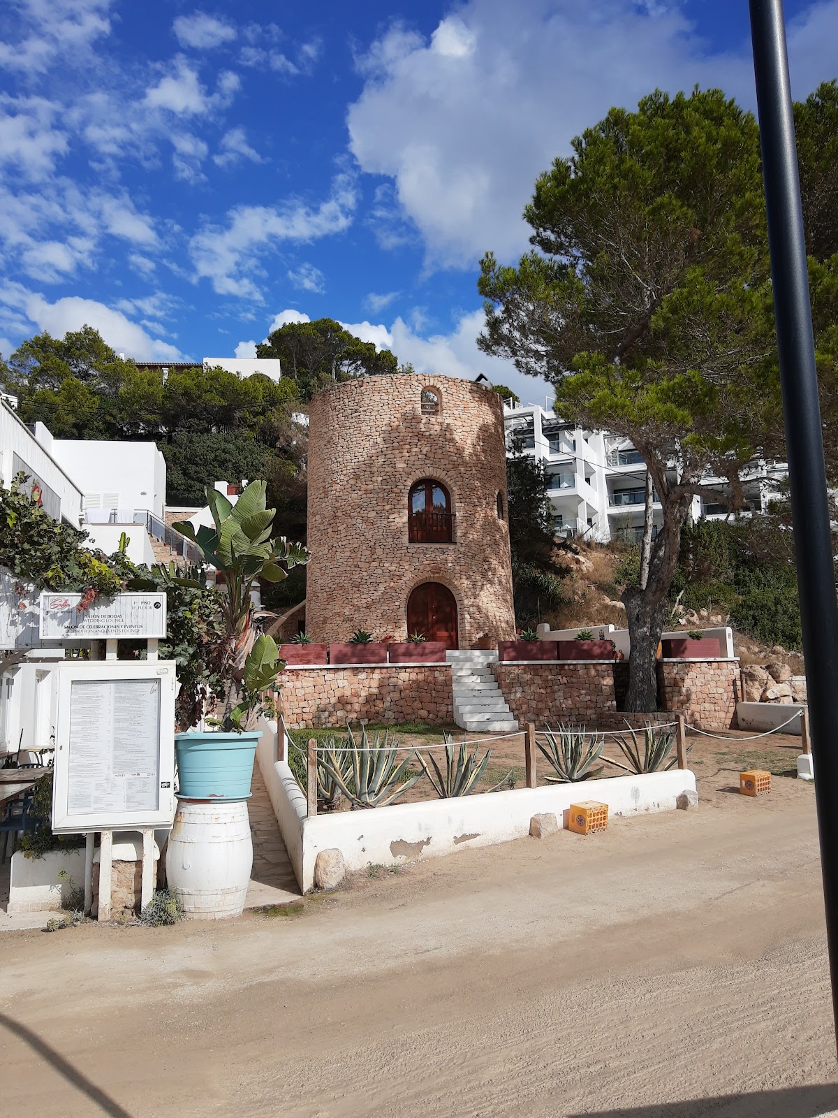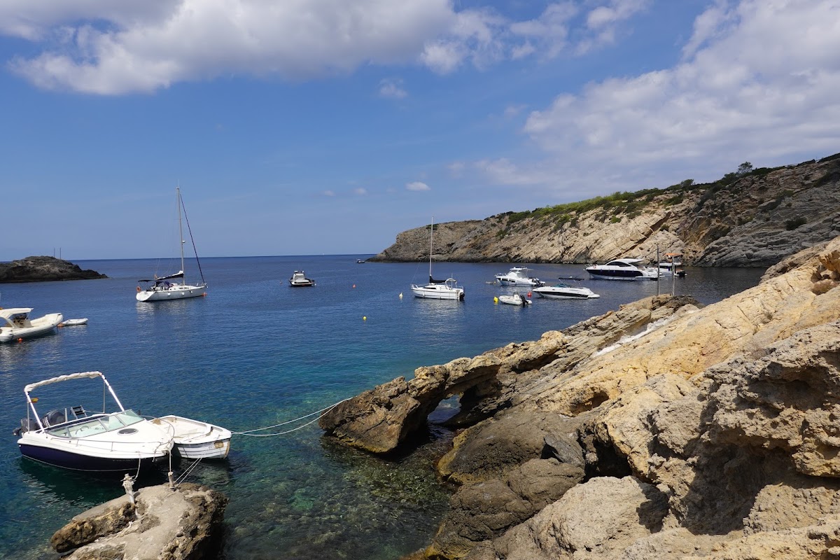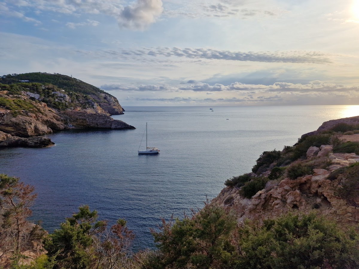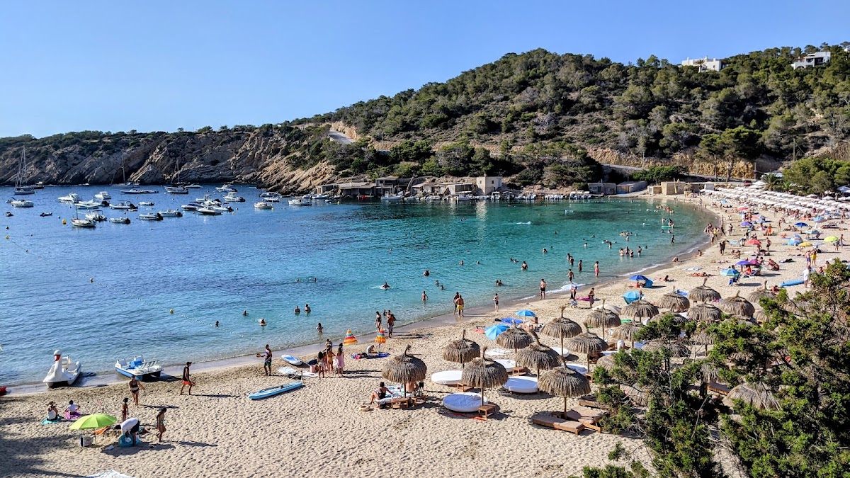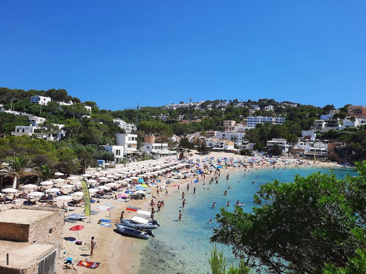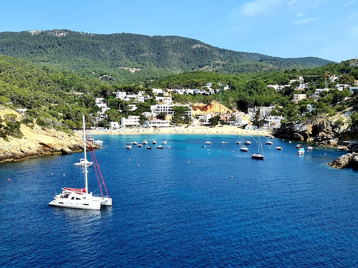 Cala Vedella is a picture-perfect sheltered bay on Ibiza's southwest coast, enclosed by pine-forested cliffs that create a natural harbor of calm, crystal-clear waters. The fine sandy beach is ideal for families, with several waterfront restaurants serving fresh fish. The bay faces west, offering beautiful sunset views.