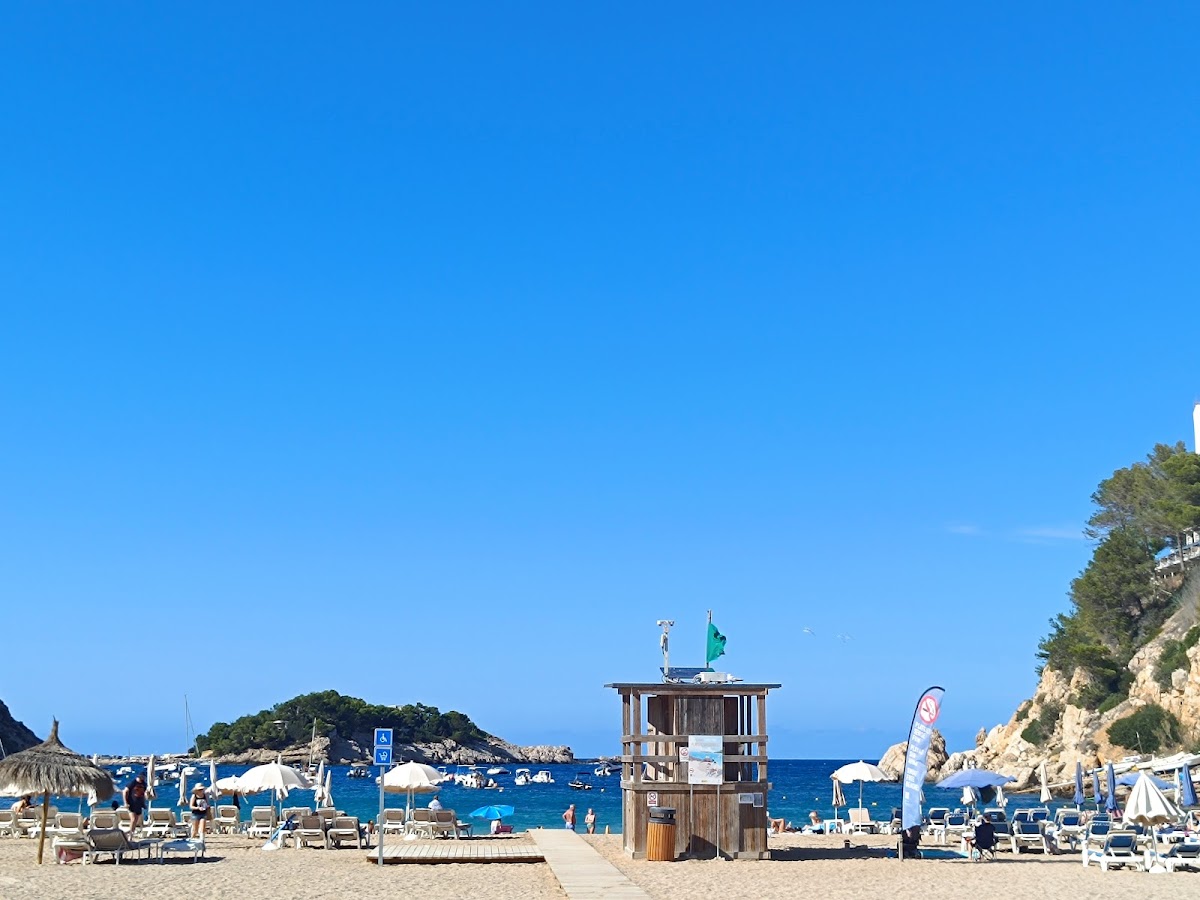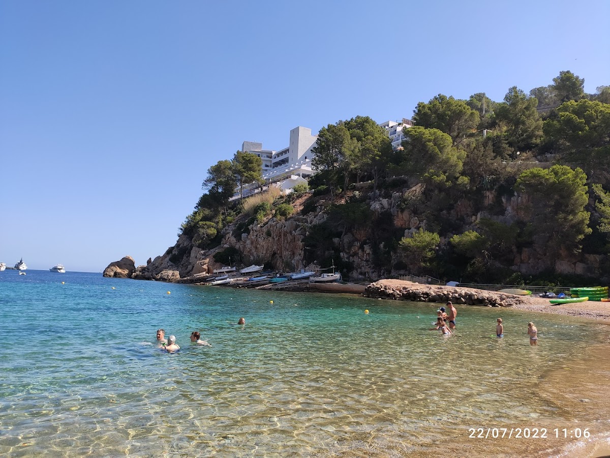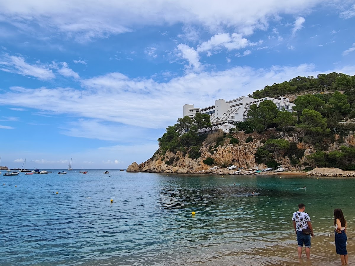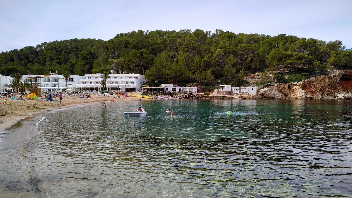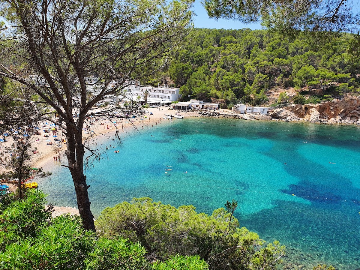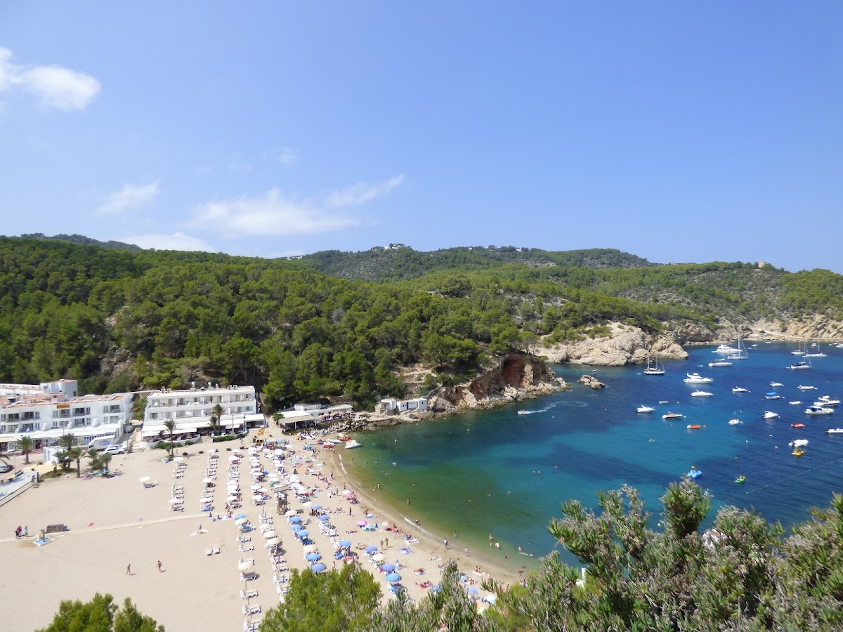 Port de Sant Miquel is a sheltered bay on Ibiza's north coast, surrounded by pine-covered hills and offering calm, family-friendly waters. The beach features a wide stretch of golden sand and is home to the nearby Cova de Can Marçà caves. Several hotels line the hillside above, and glass-bottom boats depart for secluded northern coves.